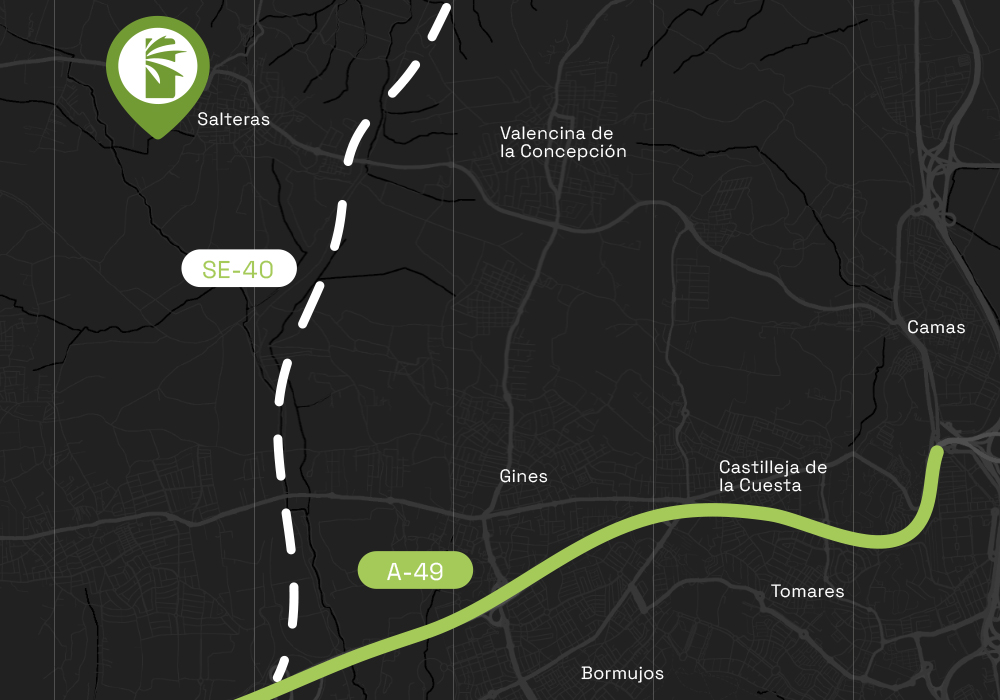La promoción se encuentra próxima a la A-49 con la nueva circunvalación SE-40. Esta nueva red de carreteras ofrece una posibilidad única de acceder de manera rápida a una de las principales vías de entrada a Sevilla además de poder viajar a las playas de Huelva. Gracias a estas conexiones podrás estar en Sevilla en menos de diez minutos.